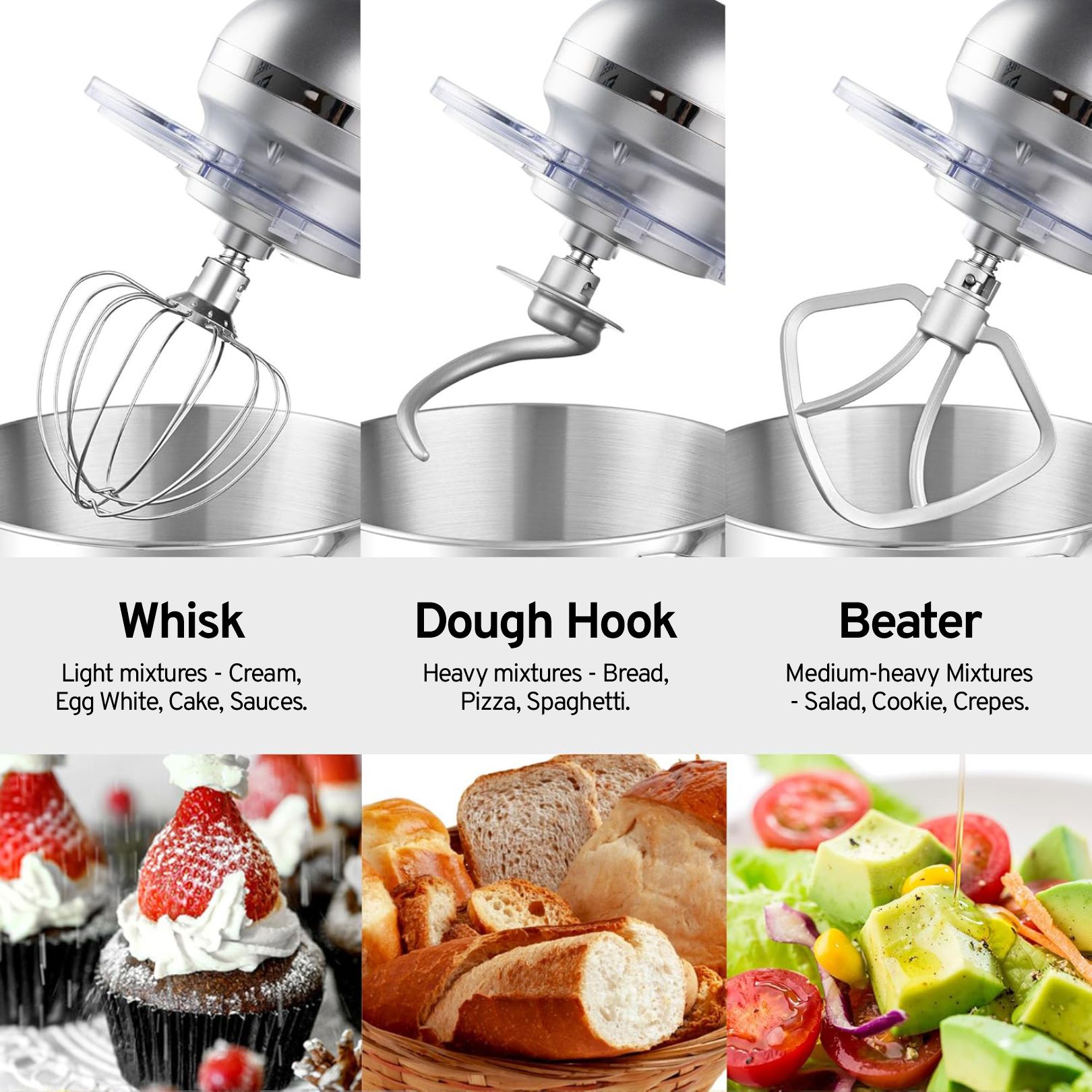 3 Aksesori Esensial: Dough Hook, Mixing Beater, Whisk. Setiap aksesori dirancang khusus untuk menghasilkan karya baking terbaik Anda. Saksikan bahan-bahan bertransformasi menjadi adonan sempurna.